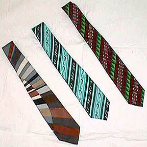 ' Emilio Pucci Florence - Made in Italy'. 100% pure silk. Very good condition. - $95. MIDDLE - Turquoise, black, and lavender diagonal striped Pucci tie. Reads 'Emilio Pucci-Florence - Made in Italy'. 100% pure silk. Very good condition. $95. RIGHT- Burgundy, green, pink and grey diagonal striped Pucci tie. Signed 'Emilio'. Pucci-no label. mint condition. $95. |