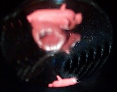 a reflected image. The actual pink object (small part visible) rests below