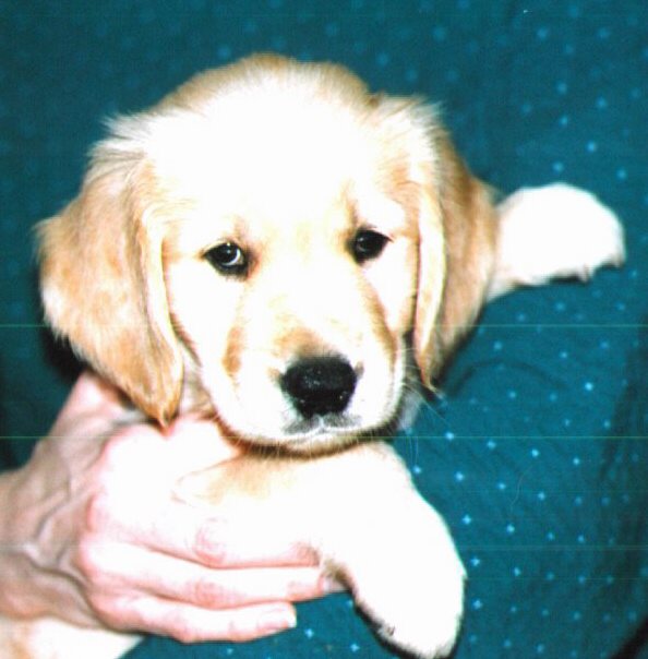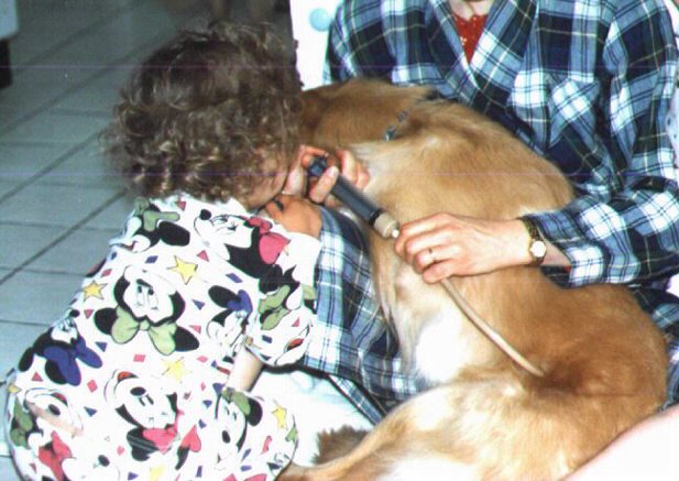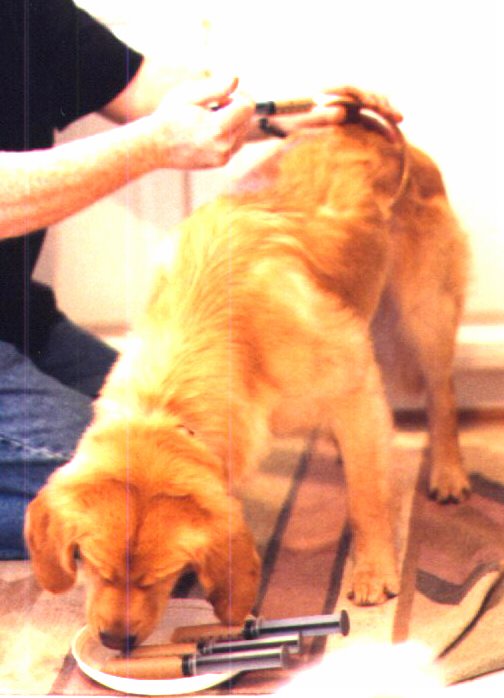 Pumpkin's Page Me at about 6 weeks Hi, my name is Pumpkin. I am a four year old Golden Retriever. I acquired my megaesophagus from vaccine induced distemper when I was about ten weeks old. When I was a pup with distemper my sister Pinky and I were quarantined for a month from our litter mates. It was during this month my sister and I had long bouts of vomiting and diarrhea. Pinky and I lost so much weight in spite of having all the dog and baby food we wanted plus special high protein food and special water with balanced electrolytes. As the distemper virus ran its course the diarrhea and vomiting slowed and my sister Pinky started to gain weight, my symptoms improved except for the vomiting. While Pinky was getting fatter and fatter I was getting skinnier and skinnier. At this point, my veterinarians made me swallow barium mixed with baby food before taking an x-ray of my esophagus. This procedure confirmed their diagnoses that I had a megaesophagus. In the next few weeks I lost more and more weight and became dehydrated. At one point I had lost more than half my body weight, which is a lot for a puppy who should be gaining weight. All the old text book procedures were tried, liquid food, dry food, canned food, eating standing, eating sitting. I tried all kinds of medicines, even Reglan injections. I also had IV fluids. I was so hungry back then I would eat anything, dirt, grass, cardboard, plastic, paper, even Styrofoam. Things were not looking good for me when my human mom (who is an R.N.) decided to try feeding me through a tube.