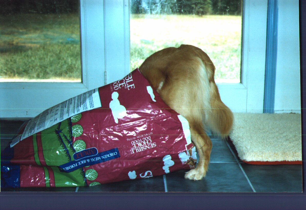 I like to lick the inside of the food bag Consequently, I had a P.E.G. tube placed through my side into my stomach. The first thing I got through my tube was water, lots of water. Next was a special liquid dog food. Within days there was improvement, no more dehydration. Careful attention was given to make sure what was going in was also coming out. The next good news was I gained some weight for the first time in months. I was fed all kinds of special foods, mostly expensive liquid or canned foods to help me gain weight. In the end what worked best for me was having the same high quality dry dog food the other dogs in the family eat, soaked in water over night and mixed in the blender with water until it looks like a milk shake. I was fed as many a six times a day at first, until my stomach grew larger and could hold lots of food and water. Before long I was gaining ounces and then pounds, in a short time I had doubled my weight. The P.E.G. tube was working fine, but I was still having some problems with reflux after I was fed. My veterinarians tried a few different medicines and found that Propulsid work best for me. I take the Propulsid about a half and hour or so before I'm fed, my veterinarians said the medicine helps my sphincter stay closed while I have a full stomach. The combination of the feeding tube and the Propulsid have reduced the number of times I have to regurgitate by about 98%. This in turn has helped my irritated esophagus heal and lessened my chances of having pneumonia. My only real problem is, I'm a dog, and dogs love to chew. I'm especially fond of sticks that fall off the trees in my back yard.
