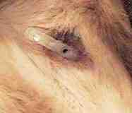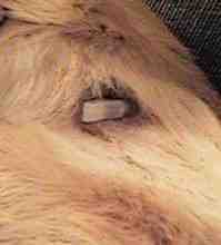 This is my second P.E.G. Tube In any case, the P.E.G. tube was working fine for several months when all of a sudden it fell out. There is a lot of wear and tear on a P.E.G. tube in a puppy. The P.E.G. tube has a large end inside the stomach and about six inches of tubing on the outside of the stomach. My tube was usually held against my side with an ace bandage. This allowed me to run and play with my litter mates. I had the first P.E.G. tube replaced with another just like the first one, while the humans in the family searched for something better. My "button" closed My "button" opened ![]()