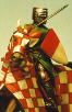 In più è ricco di “divenire”. Infatti è provvisto delle prime piastre di protezione per le braccia che venivano allacciate sopra la maglia di ferro. In Italia erano quasi sempre in cuoio bollito. Un trattamento che ne otteneva un forte irrigidimento. Queste nel nostro caso sono anche rinforzate con del metallo. Doveva appartenere ad una ricca famiglia! Così compiuta la scelta, eccomi già a sfogliare il librone delle nobili famiglie romane. Dovevo essere attento. Dovevo trovare una famiglia che certamente fosse già potente al tempo di Bonifacio VIII. La posa si presta a ritrarre un cavaliere che fornisse una sorta si servizio di sicurezza, lungo il percorso di un’ipotetica manifestazione giubilare, che so, una processione da S. Pietro a S. Giovanni. Gli armigeri del signore dovevano stare a debita distanza, quanto basta per non essere inclusi nella basetta.