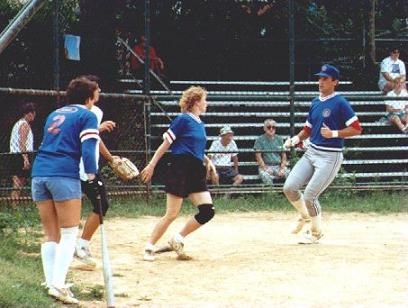 Ann Simeone (#2) coaches home plate as Kathy Hill and Mark Jenkins score the winning runs in the championship game versus Fox & Hound.